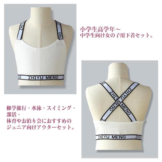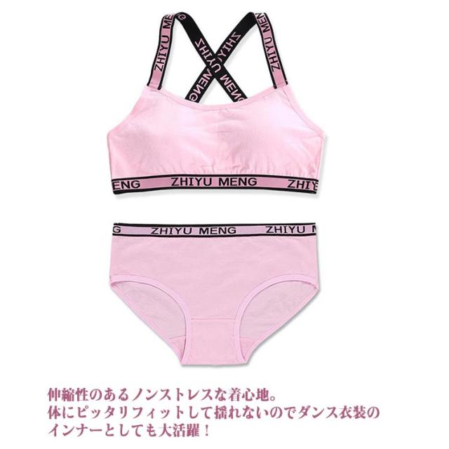 | 小学生高学年〜中学生向け女の子用下着セット。スポーツブラとパンツの上下2点セットです。 綿(コットン)素材で気持ちいい肌触り。 修学旅行・水泳・スイミング・部活・体育やお泊り会におすすめのジュニア向けアウターセット。 シンプルでおしゃれな人気の英字ロゴテープデザインがポイント。 伸縮性のあるノンストレスな着心地。体にピッタリフィットして揺れないのでダンス衣装のインナーとしても大活躍! 見えてもかっこいい英字肩紐のスポブラなので、ブラジャーはまだ早いキッズのチューブトップやブラトップとしても安心して着用いただけます。 パット入りなので安心。パッドは取り外す事が出来ます。 | |