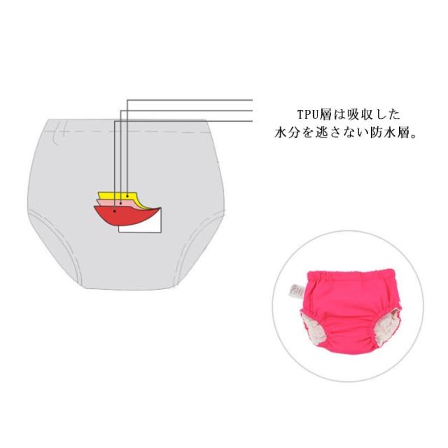 | 【5 〜 16KG 適用!】 3層構造で漏れをしっかりふせぐオムツ機能付きインナー水遊びパンツ。 簡単スナップ付きで着替えの負担を軽減。 ウエストと太ももはゴムでぴったりフィットし固形物をもらしません。 TPU層は吸収した水分を逃さない防水層。 | |