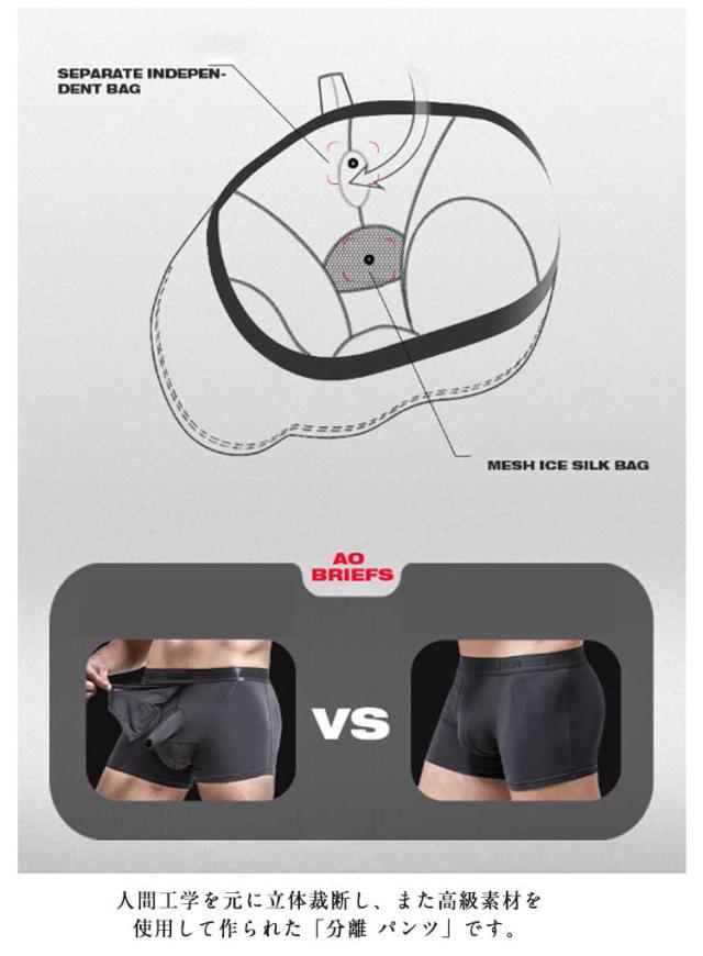 | 通気性がよく、袋と太腿付根の皮膚を隔離し、いつでも快適感を保ち、とても健康的な「分離型パンツ」です。竿、袋 分離型なのでベタツキがありません。 いんけいは前側ポケットに上向きで位置を固定して快適な状態を維持、立ったり座ったりしたときのポジションチェンジ要らずで快適です。肌への摩擦や男性の悩みである蒸れやベタツキを抑えられて、より快適で履き心地が抜群です。 人間工学を元に立体裁断し、また高級素材を使用して作られた「分離 パンツ」です。 | |