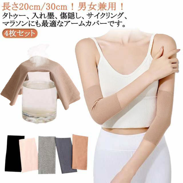 引き締め 30cm 4枚セット レディース アームカバー uvカット 20cm ストレッチ 刺青隠し 日焼け対策 温活 tatooかくし タトゥー隠し 通気性 薄手0.2cm 冷え対策 男女兼用 二の腕サポーター 隠すサポーター サポーター 傷跡かくし 二の腕カバー 夏 無地 4枚セット 関節