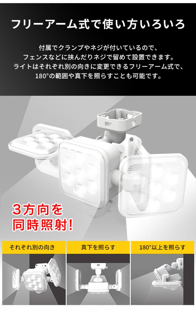 完成品 センサーライト 人感センサーライト ソーラー発電 フリーアーム式 投光器 ライト LED 防犯ライト 小型ライト 充電式 白色 高輝度 充電 自動点灯 常夜灯 非常灯 補助灯 玄関照明 おしゃれ コンパクト 停電 災害 5W 3灯