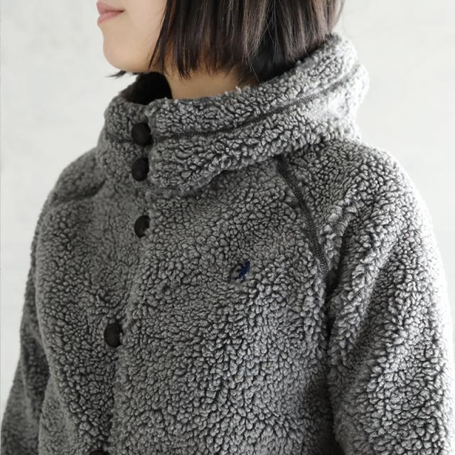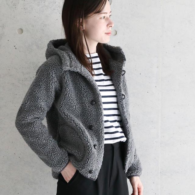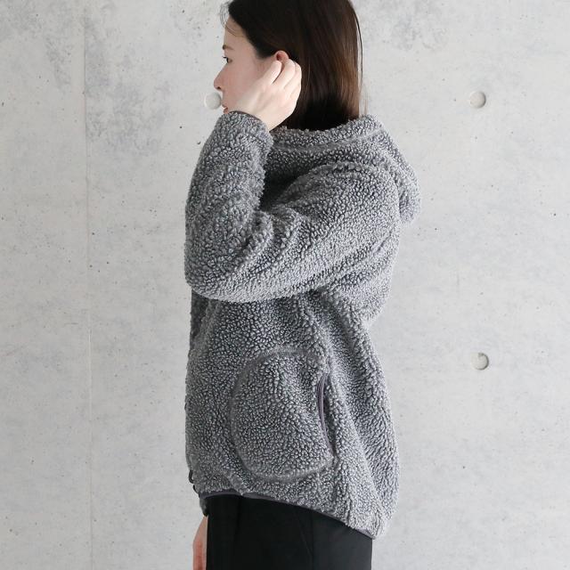 重ね着に大活躍のジムフレックスのボア。 表面はボア、裏面はスエット地であたたかく小さめのフードがついているのでバックスタイルもすっきり。