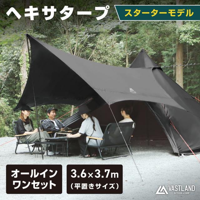 VASTLAND タープ ヘキサタープ 380cm×370cm 延長ベルト ポール付き オールインワンセット