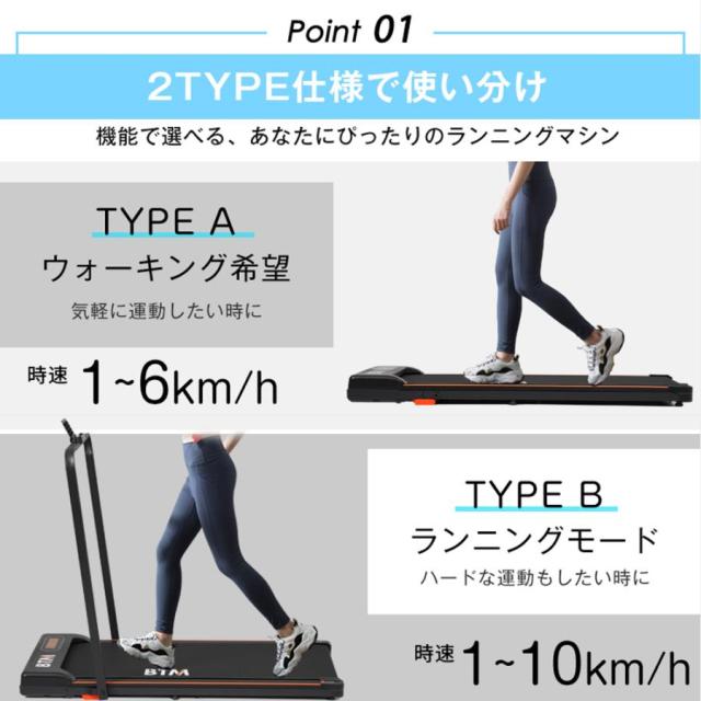 【2TYPE仕様で使い分け】機能で選べる、あなたにひったりのランニングマシン TYPE Aウオーキング希望 時速1~6km/h TYPE B ランニングモード 時速1~10km/h 0.1km/h刻みで調節できるのでお好みの速度に出会元る
