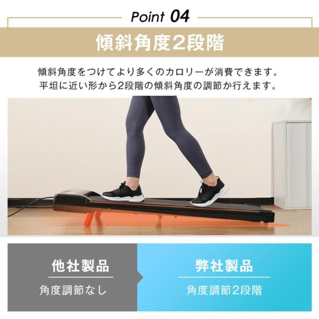 【傾斜角度2段階】傾斜角度をつけてより多くのカロリーが消費できます。平坦に近い形から2段階の傾斜角度の調節か行えます。