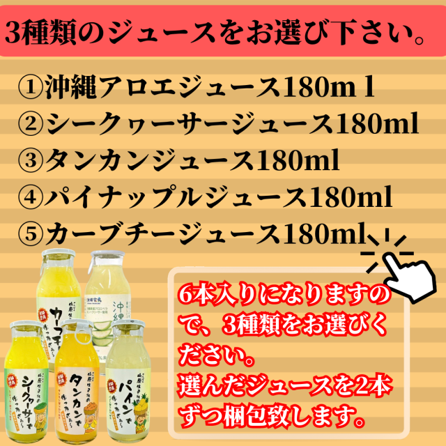 ●お好きなジュースを3種類お選びください。選ばれたジュースを2本ずつを梱包致します。
