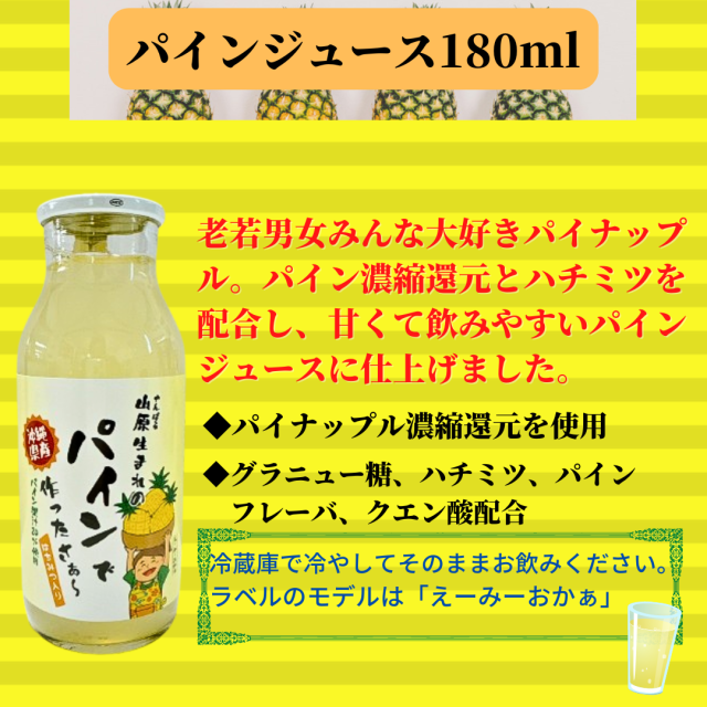 ◇パイナップルドリンク:沖縄県山原地方のパインを使用した濃縮還元パインを20%使用し、自然な甘みと爽やかな風味が特徴です。
