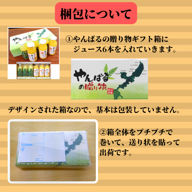 化粧箱には沖縄本島のイラストと「沖縄県産やんばるの贈り物」が表記されているので、見た目にも中身にも沖縄からのジュースだと分かりやすくなっております。通常は綺麗な化粧箱でお届けしておりますが、その上からさらに包装希望の方はご注文時に「包装希望」とお申し付けください。