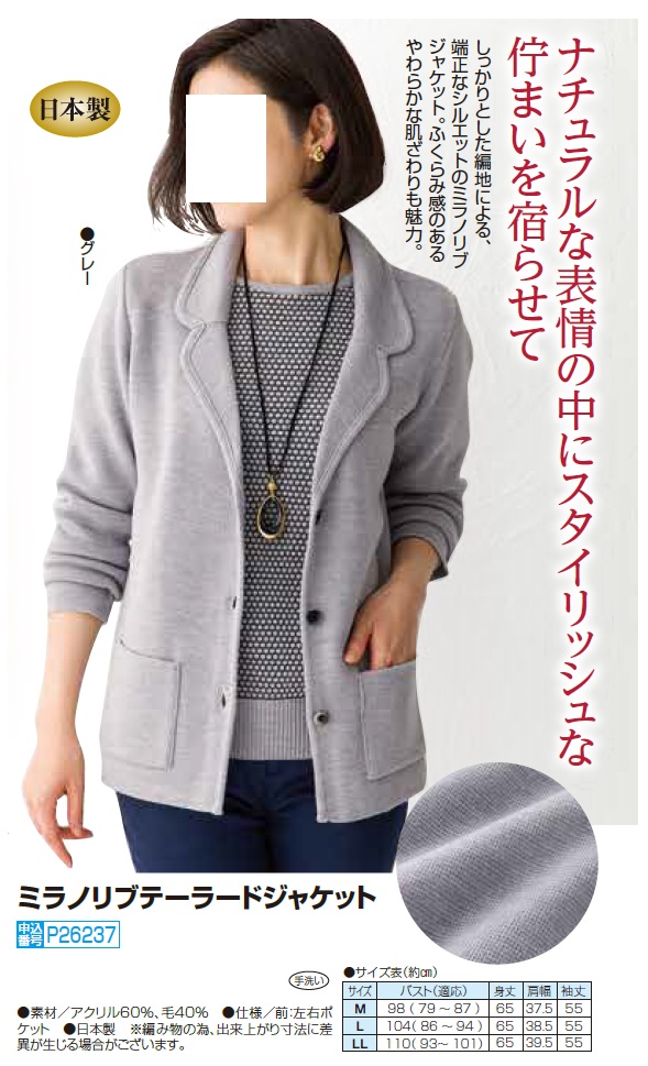 ニットジャケット レディース 襟付き ウール混 日本製 ミラノリブ テーラードジャケット グレー 婦人服 ミセス シニア 女性 無地 シンプル 上品 ミラノリブニット カーディガン 40代 50代 60代 70代 80代 母の日 お母さん おばあちゃん 秋冬 オフィス fuji p26237