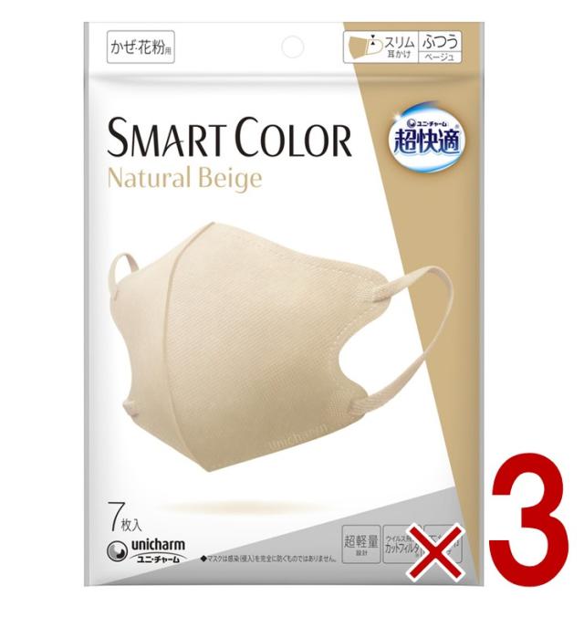 【12-15日限定 タイムセール】ユニチャーム 超快適 スマートカラー 7枚入 ナチュラル ベージュ ふつうサイズ SMART COLOR Natural Beige 超軽量マスク 3個