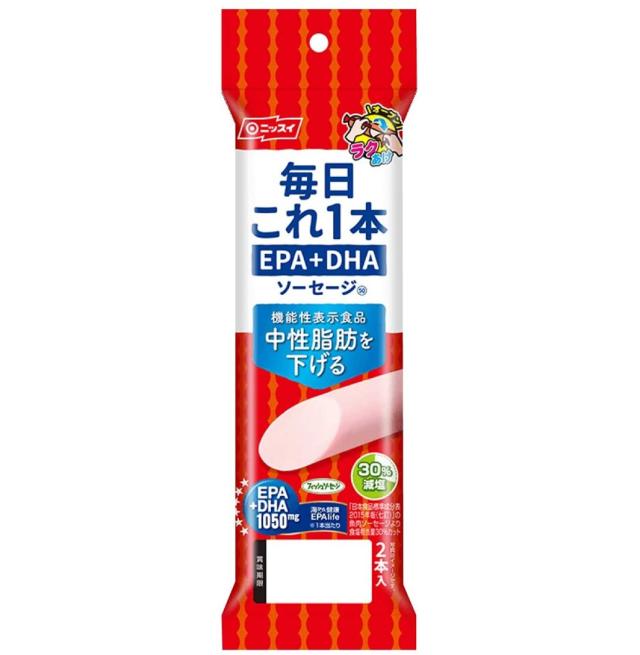 【商品説明】ニッスイ 毎日これ一本 EPA+DHA ソーセージ 100g(50g×2本)1本で1,050mgのEPA・DHAが摂取できます。塩分を30%カットしました。(「日本食品標準成分表2015年度版(七訂)」魚肉ソーセージ食塩相当量比)機能性表示食品です(届出番号C86)。本品には、EPA・DHAが含まれます。EPA・DHAには中性脂肪値を下げる作用があることが報告されています。とめ金のない「エコクリップ」。どこからでも、何度でも開けられる「ラクあけ」。常温で保存できます。卵を使用していないので、卵アレルギーの方も安心です。賞味期限メーカー製造より90日※実際にお届けするものは在庫状況により短くなる場合がございます。予めご了承ください。保存方法 直射日光をさけて保存(常温)メーカー名 日本水産株式会社〒105-8676東京都港区西新橋1-3-1?西新橋スクエアTEL:0120-837-241