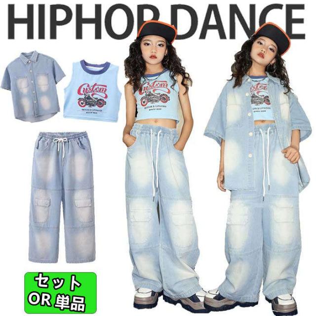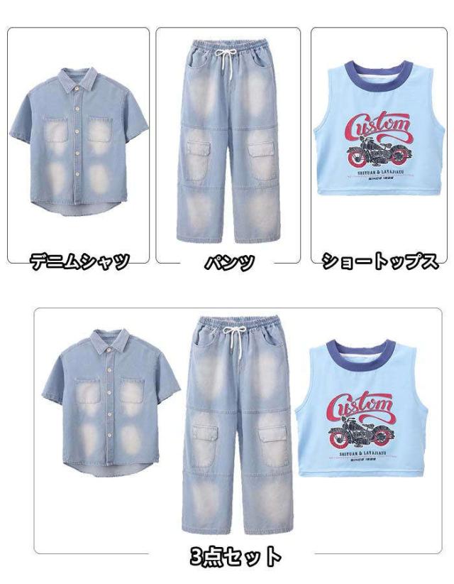 キッズダンス衣装 デニム 女の子 デニムシャツ 半袖 デニムパンツ ダンスウェア ロングパンツ ダンス服 長ズボン 子供服 セットアップ