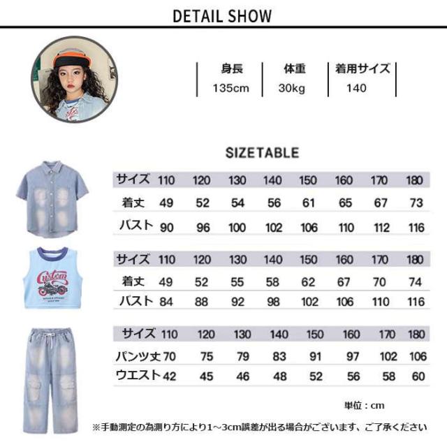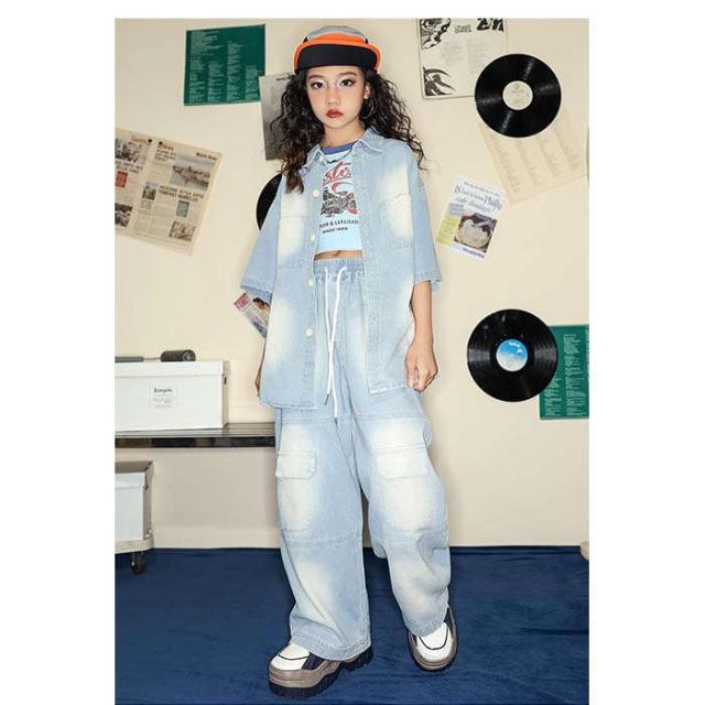商品名:キッズダンス衣装 デニム 女の子 デニムシャツ 半袖 デニムパンツ ダンスウェア ロングパンツ ダンス服 長ズボン 子供服 セットアップ ヒップホップ ジャズダンス k-pop hiphop 演出服 団体服 原宿系 可愛い ダンス発表会 お揃い ステージ衣装 イベント衣装 おしゃれ 発表会 踊りイベント衣装 110-180