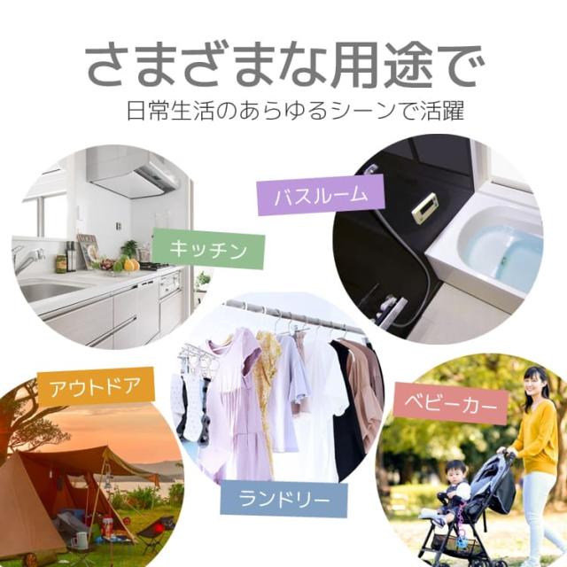 キッチン収納やバスルーム収納、洗濯物干しなどの日常生活での使用をはじめ、キャンプやBBQなどのアウトドアシーン、またベビーカーでのお子さまのシューズハンガーや帽子フックとしてなど、幅広い用途とシーンで活躍します。