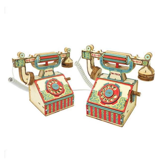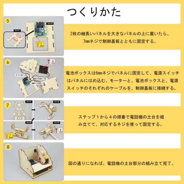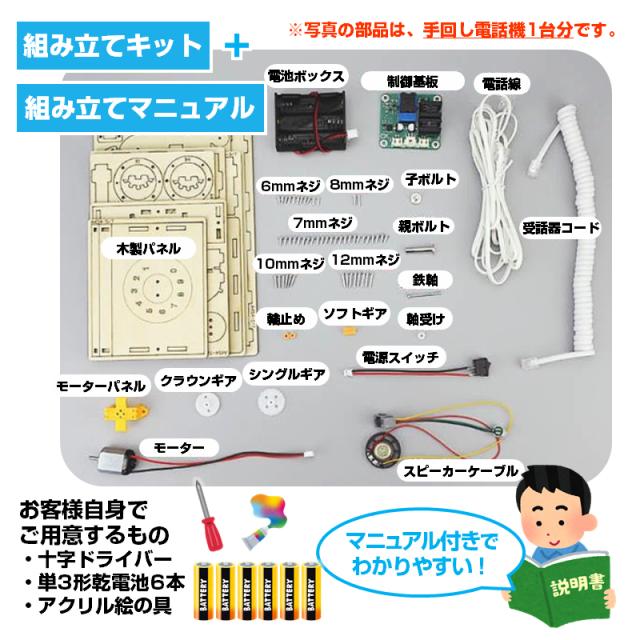 キット内容:組み立てマニュアル、電話機2台分組み立てキット(木製パネル、電池ボックス、制御基板、電話線、受話器コード、6mmネジ、7mmネジ、8mmネジ、10mmネジ、12mmネジ、輪止め、ソフトギア、親ボルト、子ボルト、鉄軸、軸受け、モーターパネル、クラウンギア、シングルギア、電源スイッチ、モーター、スピーカーケーブル),