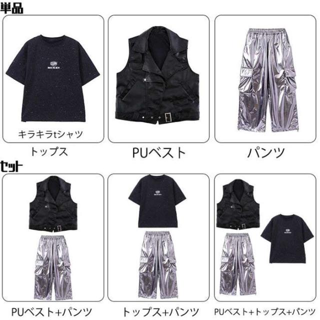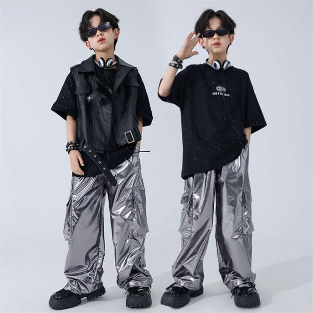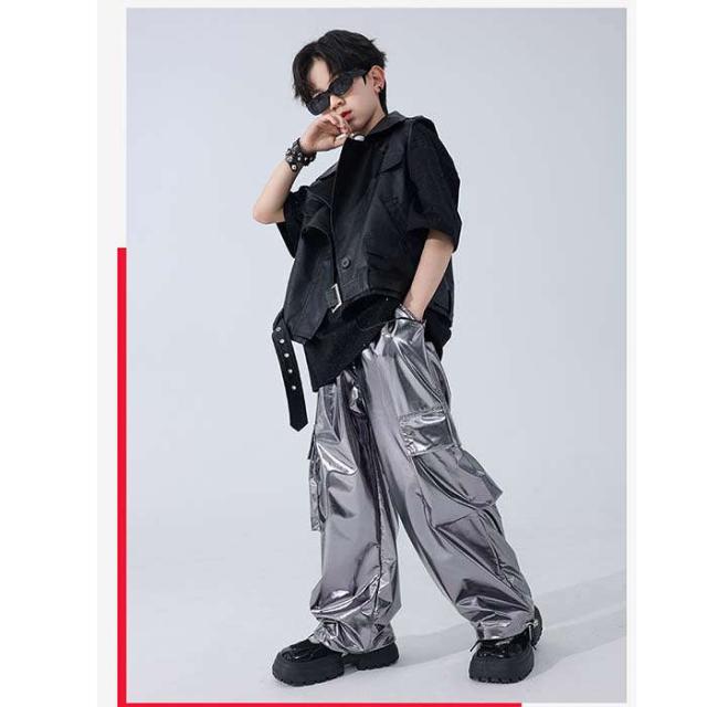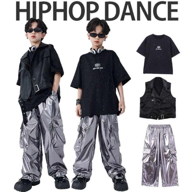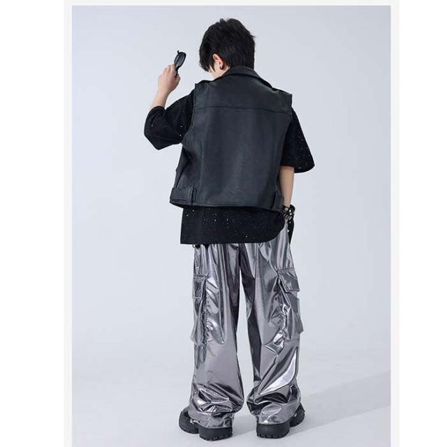 ダンスウェア 男の子 カジュアルシャツ tシャツ 半袖 PU革ベスト カーゴパンツ ロングパンツ 長ズボン ダンス服 トップスキラキラ