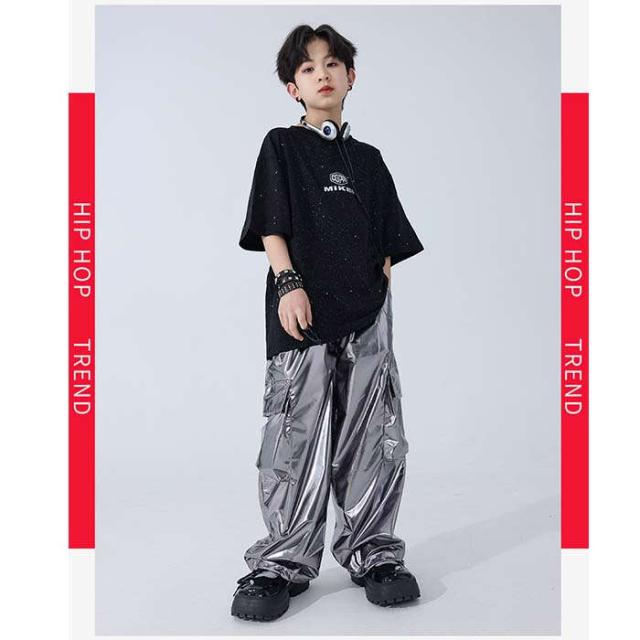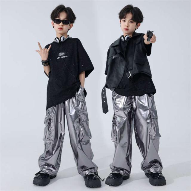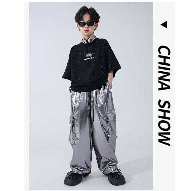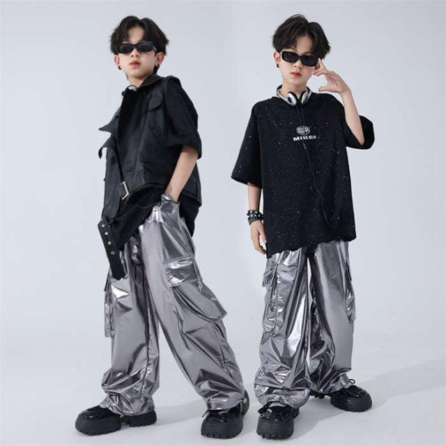 商品名:ダンスウェア 男の子 カジュアルシャツ tシャツ 半袖 PU革ベスト カーゴパンツ ロングパンツ 長ズボン ダンス服 トップス キラキラ 星柄tシャツ シルバーパンツ ヒップホップ k-pop jazz hiphop ジャズダンス キッズダンス衣装 子供服 セットアップ かっこいい 発表会 演出服 団体服 練習着 120cm-180cm