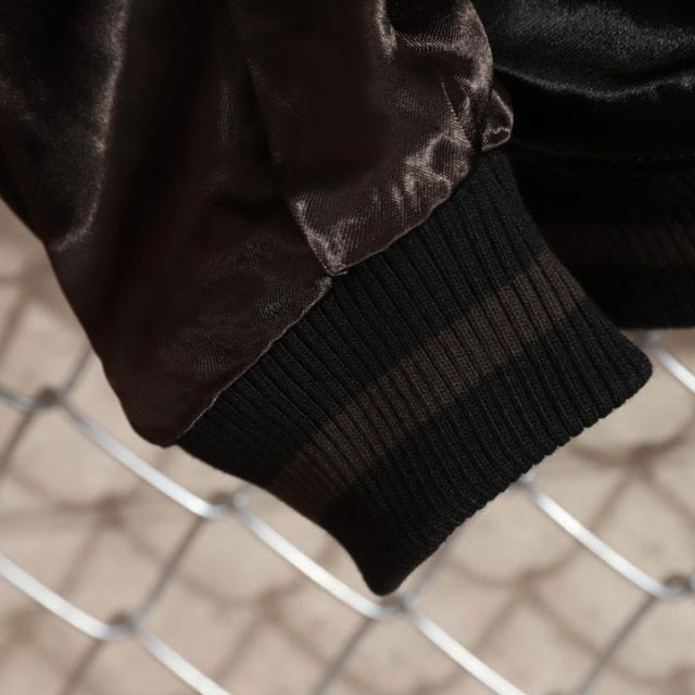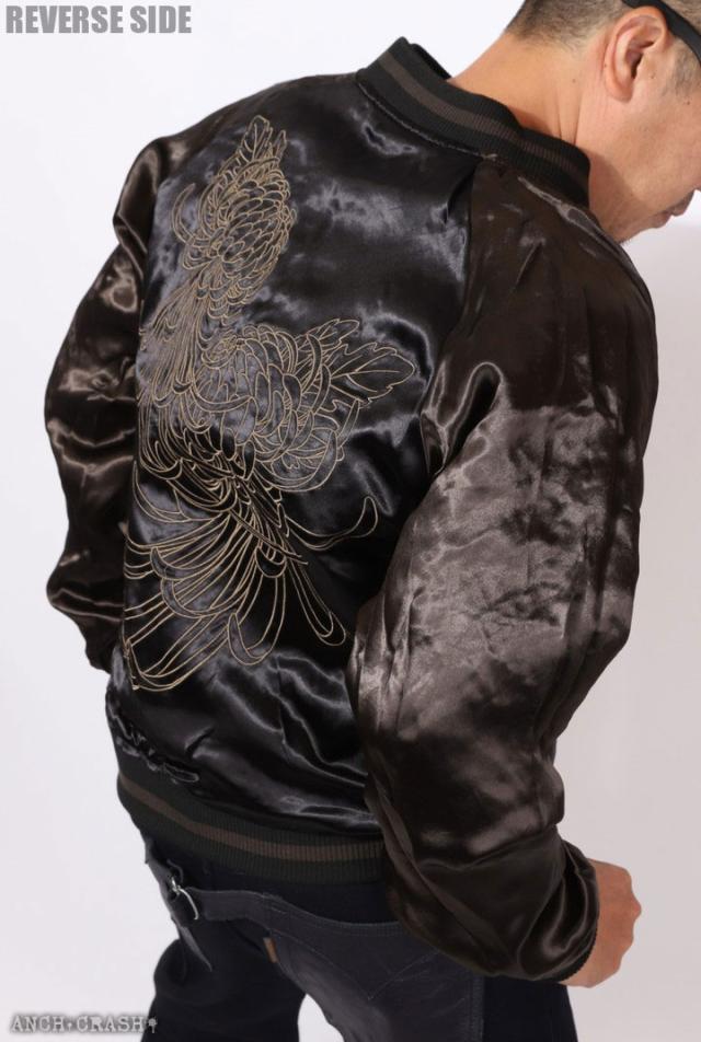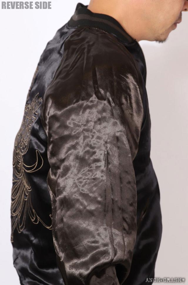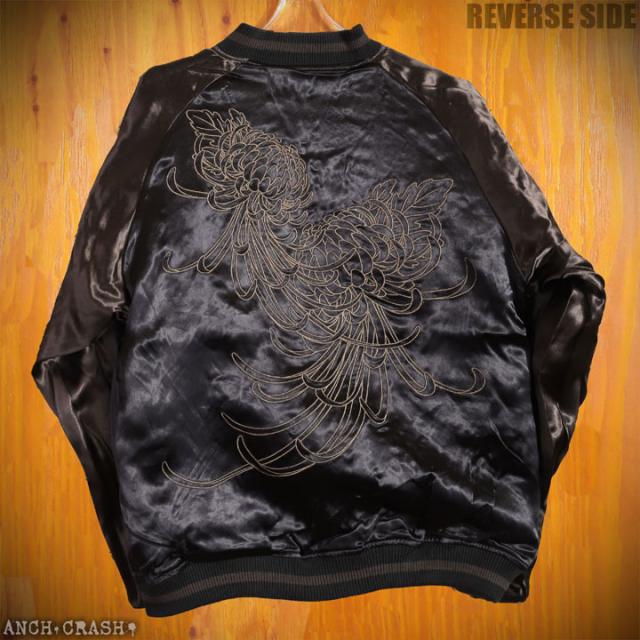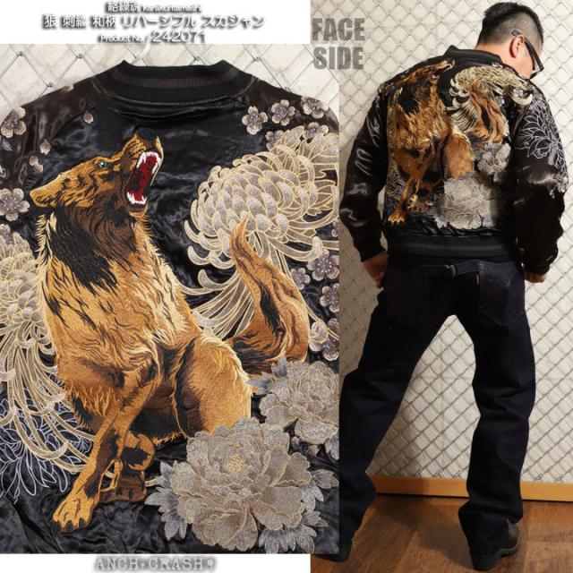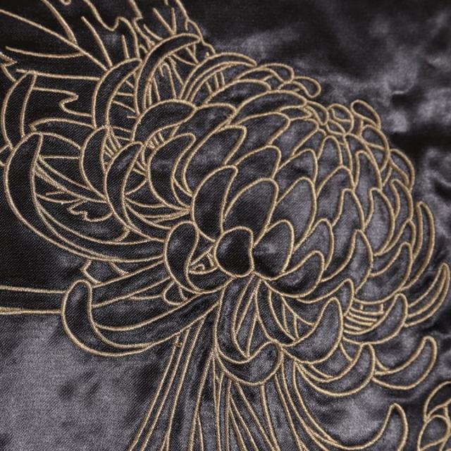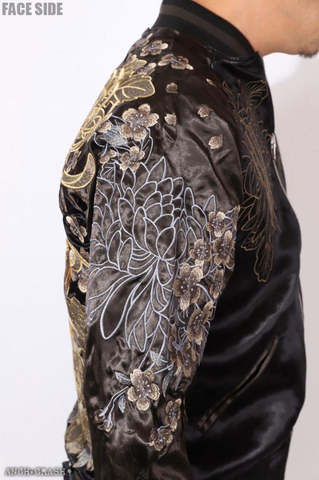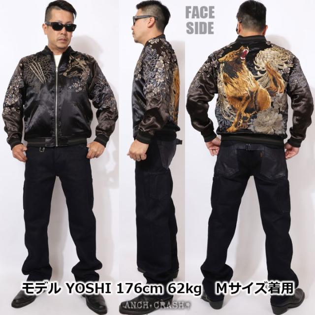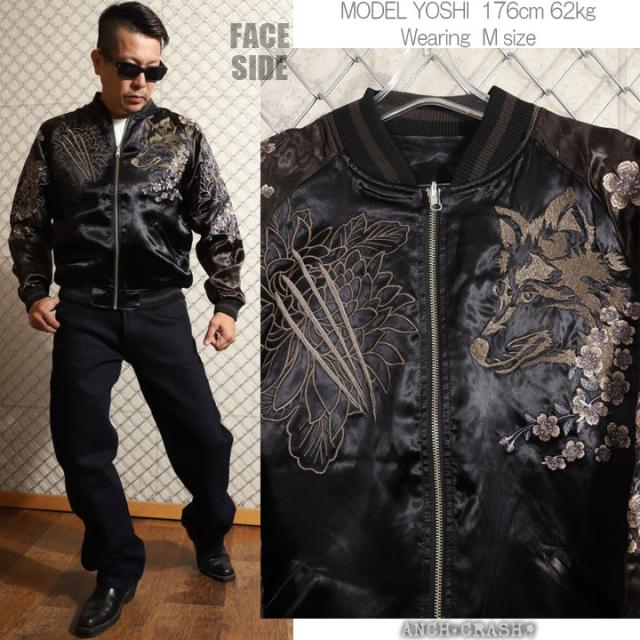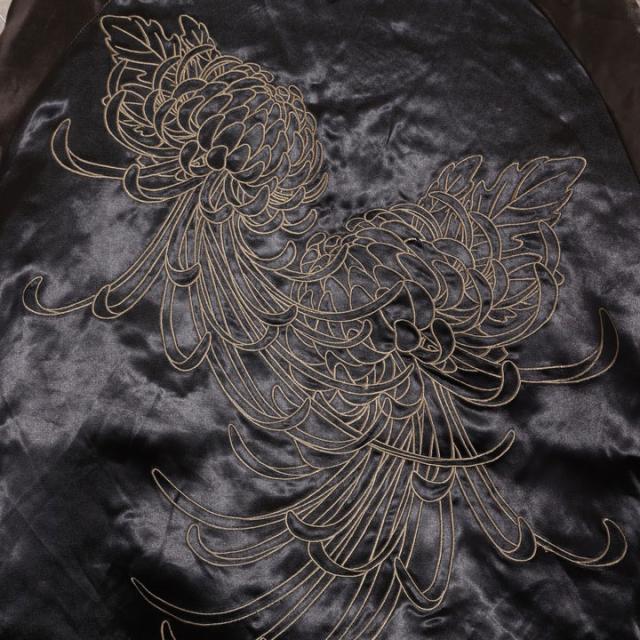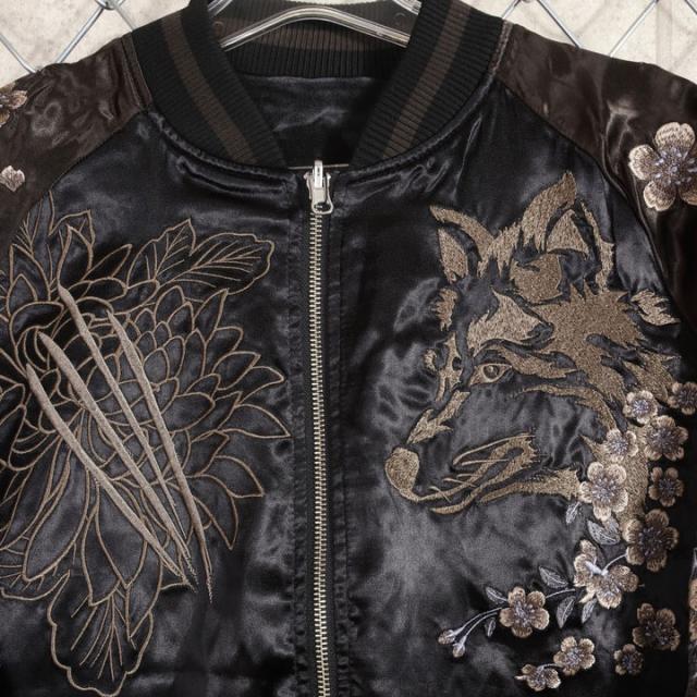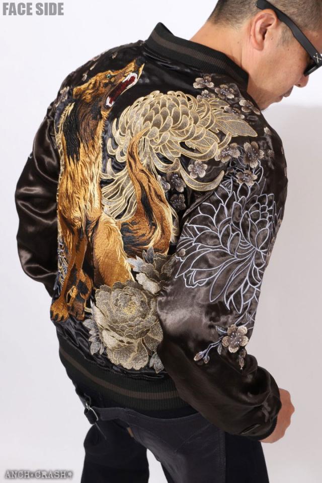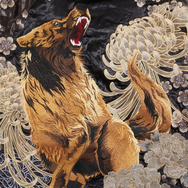 フェイスサイドは遠吠えする狼に菊や牡丹、桜などの花々を大胆にアレンジした、刺繍の豪華さが際立つスカジャン!
