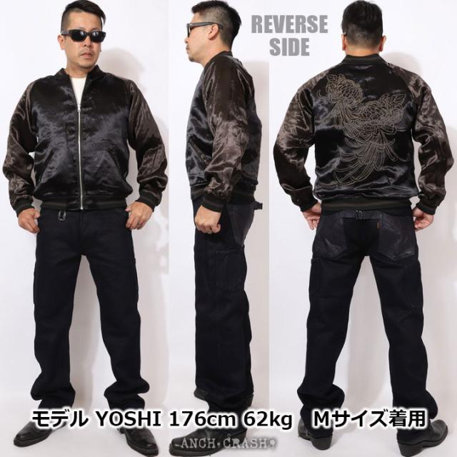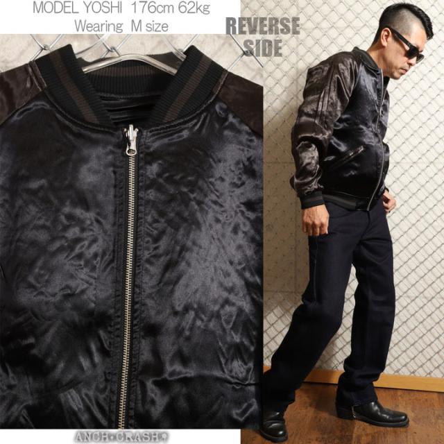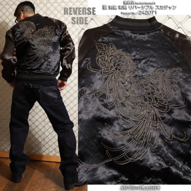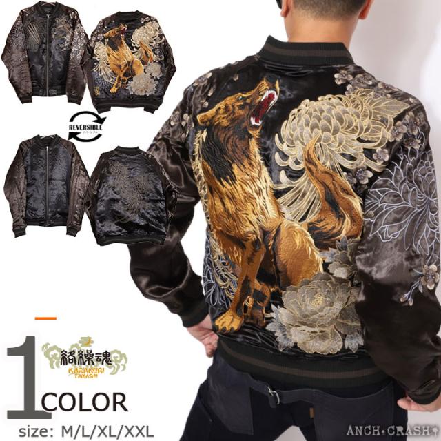 絡繰魂 和柄 リバーシブル 刺繍 スカジャン 狼 刺繍 (242071-25)【送料無料】ブラック×チャコール からくり メンズ