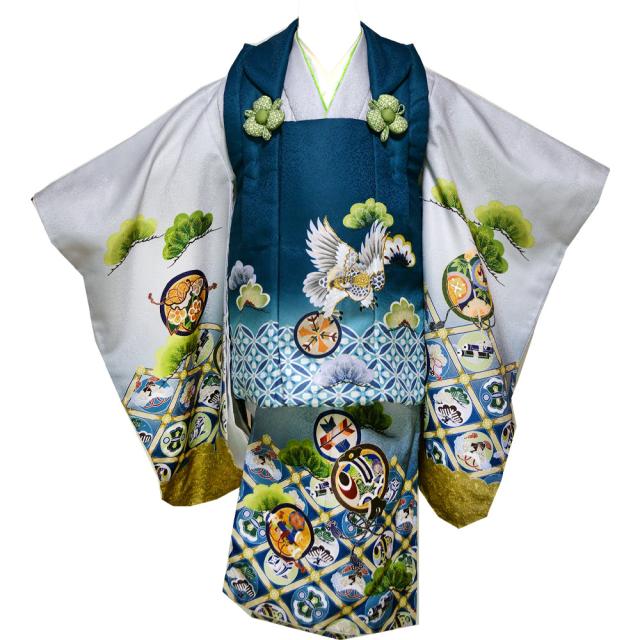 【レンタル】 七五三 着物 男の子 絵羽柄 3歳 8点 被布 セット 3(被布青緑・着物グレー) 三歳 レトロ 古典柄 【 被布 セット 男の子 子供