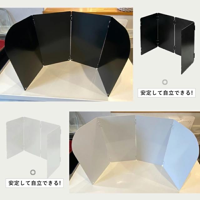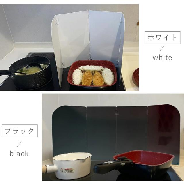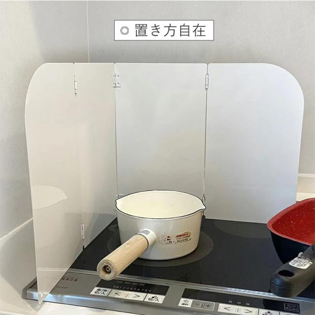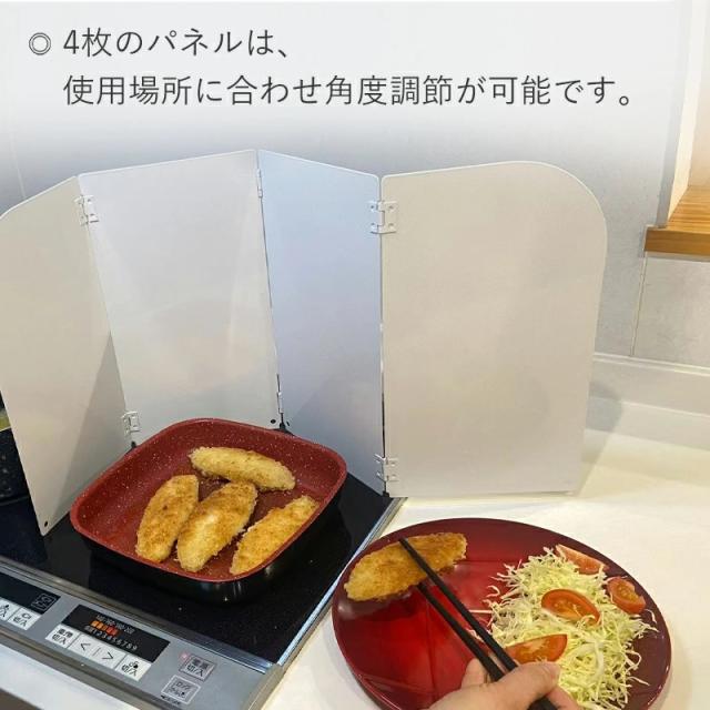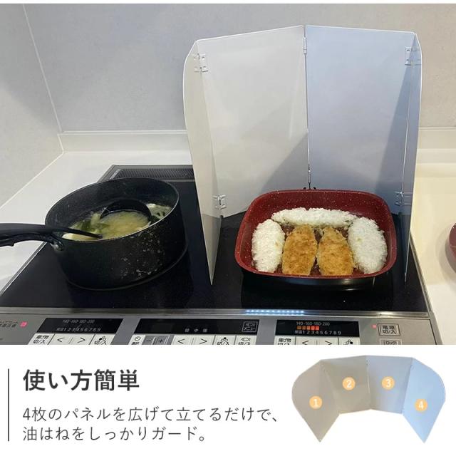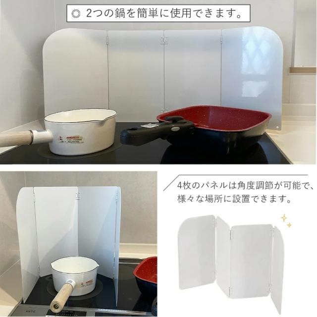 油はねガードは調理の需要によって、サイズと形が自由に変えられる便利な4枚パネルでコンロを良く囲って、キッチンの壁に飛び散る料理の油汚れや汁はねなどを逃しません。