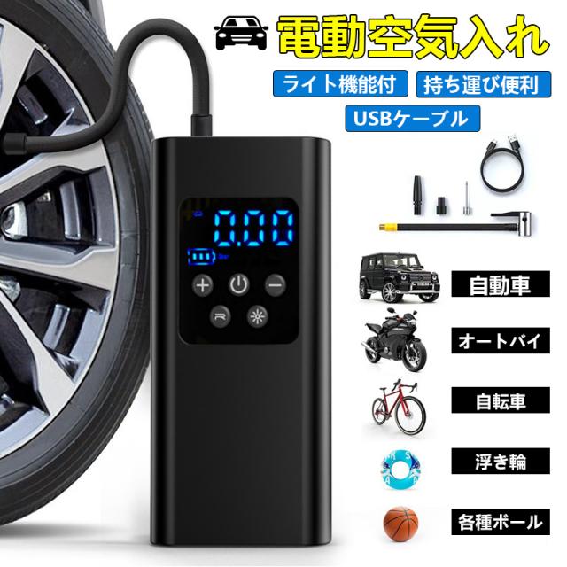 電動空気入れ 自動車 エアーポンプ 充電式 車 バイク 自転車 ボール タイヤ 浮き輪 USB コンプレッサー 軽量 小型 事故防止 防災 懐中電灯