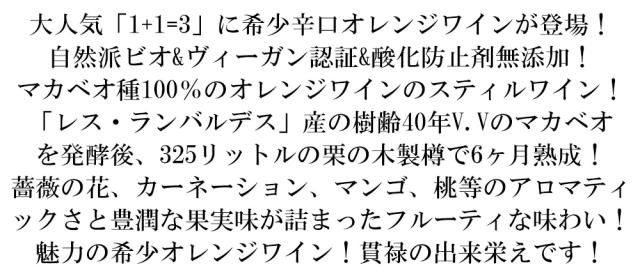 大人気「1+1=3」に希少辛口オレンジワインが登場! 自然派ビオ&ヴィーガン認証&酸化防止剤無添加! マカベオ種100%のオレンジワインのスティルワイン! 「レス・ランバルデス」産の樹齢40年V.Vのマカベオ を発酵後、325リットルの栗の木製樽で6ヶ月熟成! 薔薇の花、カーネーション、マンゴ、桃等のアロマティ ックさと豊潤な果実味が詰まったフルーティな味わい! 魅力の希少オレンジワイン!貫禄の出来栄えです!