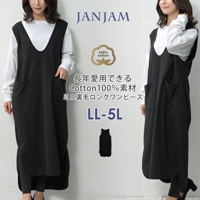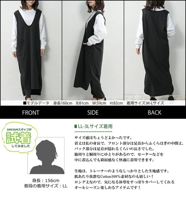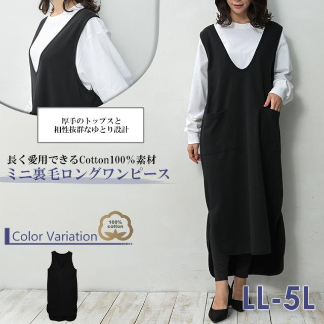 送料無料※沖縄/北海道対象外 大きいサイズ レディース ジャンパースカート ロング丈 ノースリーブ ミニ裏毛 Vネック ワンピース cotton100 LL-3L/4L-5L ゆったりサイズ ぽっちゃり女子 プラスサイズ