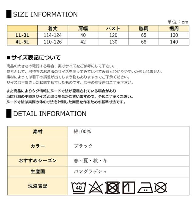 LL-3L:着丈114-124 肩幅40 バスト120 脇周65 裾周130