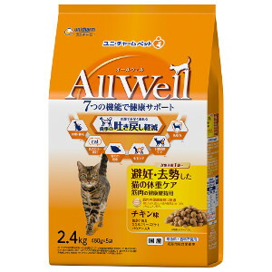 【今ならミズノの靴下1足をプレゼント】ユニ・チャーム AllWell 避妊・去勢した猫の体重ケア 筋肉の健康維持用 チキン味挽き小魚とささみ フリーズドライパウダー入り 2.4kg※メーカー都合によりパッケージ、デザインが変更となる場合がございます