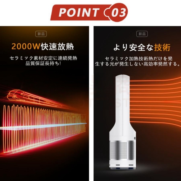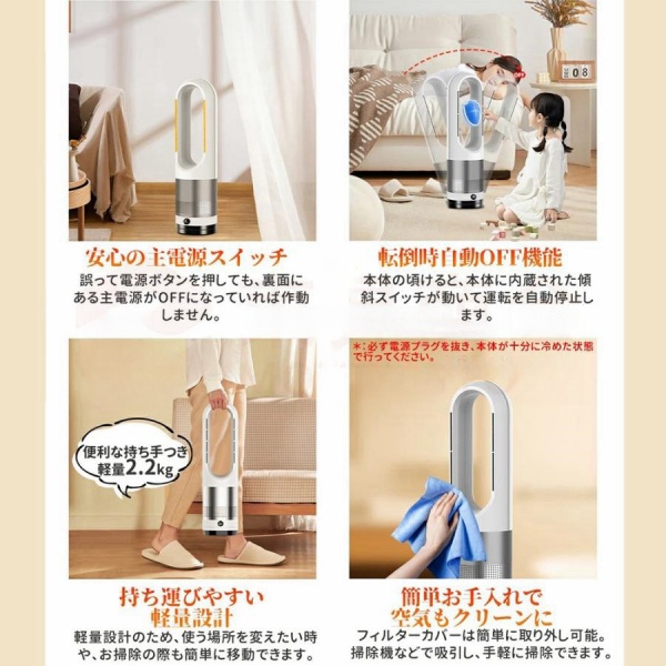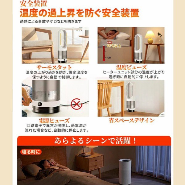 ・複数の安全機能を備えているため、お客様のニーズに応えるために他のポータブル電気ヒーターよりも細部にまで気を配っています。「PSE認証済み」: 高い安全性を保証。「自転倒自動OFF機能」: 突発的な原因で転倒すると、ヒーターが自動停止。「過熱自動保護機能」: 暖房内部が過熱すると、サーモスタット、電流、温度ヒューズが電源を遮断。「V0級の難燃耐火素材」: 難燃性PTC素材を使用し、羽根なしセラミックファンヒーター ので、火傷も防ぎます。お子供とペットがいる家庭はご安心にお使いいただけます。