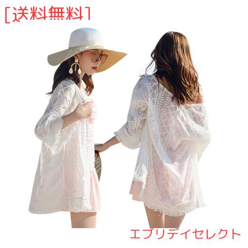 [LA-Hazel] ビーチウェア ビキニカバー ブラウス パレオ水着 ビーチドレス ボヘミアン オリジナル柄 羽織 レース編み 長袖 七分袖 透け感