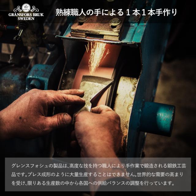グレンスフォシュ・ブルーク社が作る斧は、ひとつひとつ手作業で鍛造されてます。私たちは職人がじっくり時間をかけてその技を発揮できるようにするべきと考え、歩合制の給与体系を何年も前に廃止しています。鍛冶職人が精魂込めて鍛造した高品質の斧には画一的な仕上げは不要であり、手作業の痕跡を隠す必要もないのです。刃先を砥ぐ以外、斧頭の研磨やならしは行っていません。塗装や艶出しも不要です。グレンスフォシュ斧の柄には伝統的な木製のクサビを、付属の革製ケースには植物タンニンでなめしたヌメ革を使用しています。職人技術に基づいた伝統的な製造方法で作られる斧は、往々にして忘れ去られがちな古来の知識に基づく技術と形状、そして機能が、現代の薪づくりやキャンプなど小規模作業に適した形で活かされています。