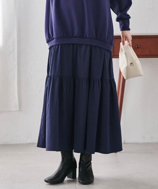 ・きれいめスウェットとティアードスカートをドッキングしたデザインのワンピース。