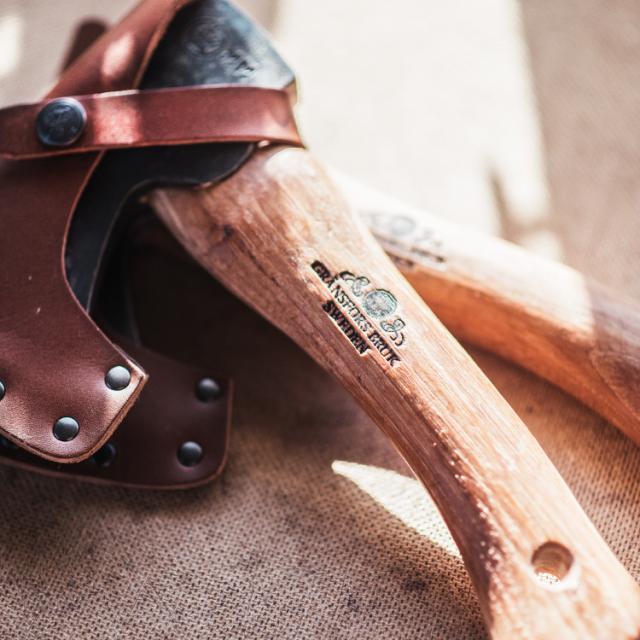 グレンスフォシュ・ブルーク社が作る斧は、ひとつひとつ手作業で鍛造されてます。私たちは職人がじっくり時間をかけてその技を発揮できるようにするべきと考え、歩合制の給与体系を何年も前に廃止しています。鍛冶職人が精魂込めて鍛造した高品質の斧には画一的な仕上げは不要であり、手作業の痕跡を隠す必要もないのです。刃先を砥ぐ以外、斧頭の研磨やならしは行っていません。塗装や艶出しも不要です。グレンスフォシュ斧の柄には伝統的な木製のクサビを、付属の革製ケースには植物タンニンでなめしたヌメ革を使用しています。職人技術に基づいた伝統的な製造方法で作られる斧は、往々にして忘れ去られがちな古来の知識に基づく技術と形状、そして機能が、現代の薪づくりやキャンプなど小規模作業に適した形で活かされています。