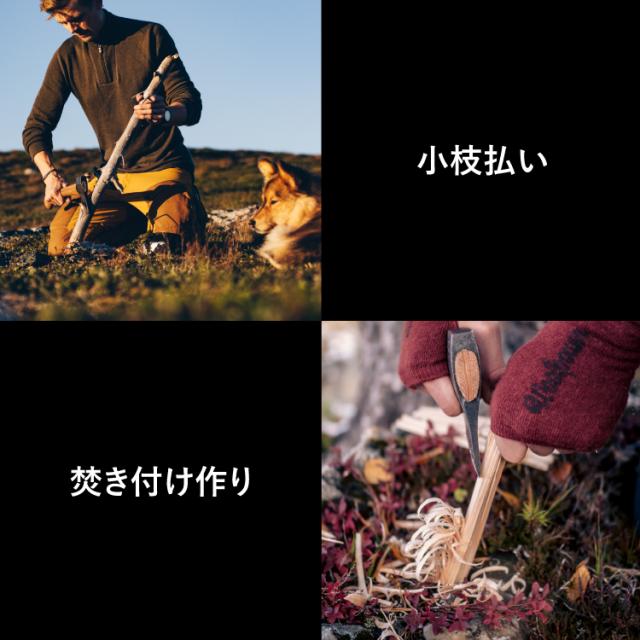 ヘッドのサイズに対してハンドルが短く、ユニークなフォルムのハンドハチェットです。携帯しやすいサイズ感なので、バックパックに取り付けて森の中を散策する際にも便利です。シースが刃先から斧頭までカバーしている為、バックパックの中にそのまま放り込む事も可能。短いハンドルながら、小さな木であれば切り倒す事も出来るので、様々な野外活動に最適のモデルです。もちろん焚き付け作りや枝払いにも優れた能力を発揮します。 またハンドル部分には弧を描くような窪みが施されており、濡れた手でもしっかりとグリップする事が可能です。