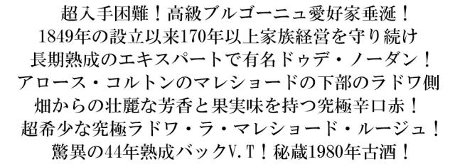 超入手困難!高級ブルゴーニュ愛好家垂涎! 1849年の設立以来170年以上家族経営を守り続け 長期熟成のエキスパートで有名ドゥデ・ノーダン! アロース・コルトンのマレショードの下部のラドワ側 畑からの壮麗な芳香と果実味を持つ究極辛口赤! 超希少な究極ラドワ・ラ・マレショード・ルージュ! 驚異の44年熟成バックV.T!秘蔵1980年古酒!