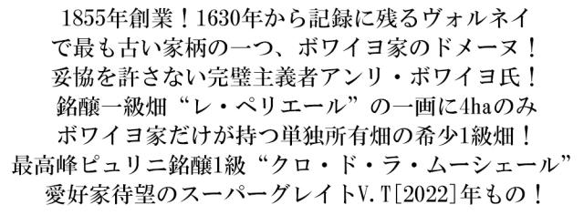 1855年創業!1630年から記録に残るヴォルネイ で最も古い家柄の一つ、ボワイヨ家のドメーヌ! 妥協を許さない完璧主義者アンリ・ボワイヨ氏! 銘醸一級畑“レ・ペリエール”の一画に4haのみ ボワイヨ家だけが持つ単独所有畑の希少1級畑! 最高峰ピュリニ銘醸1級“クロ・ド・ラ・ムーシェール” 愛好家待望のスーパーグレイトV.T[2022]年もの!