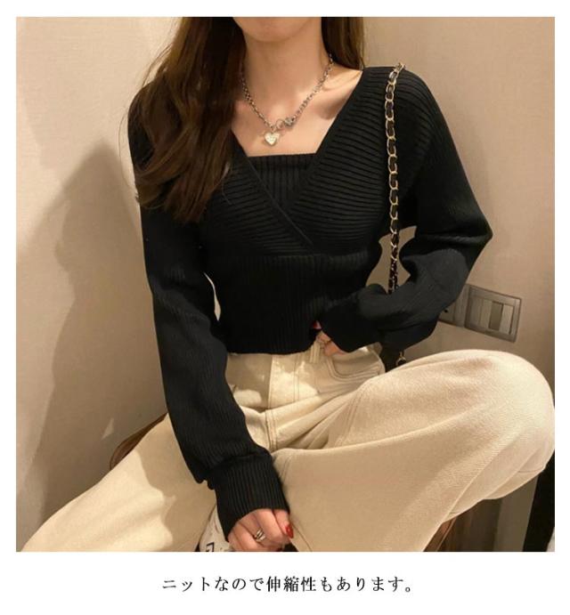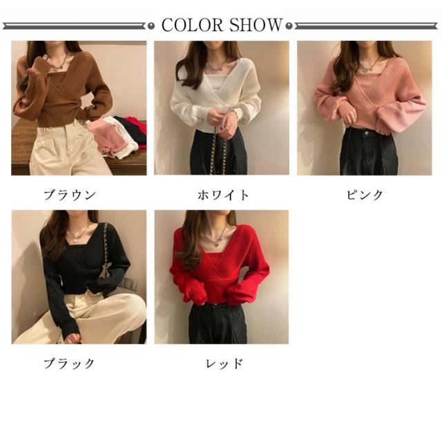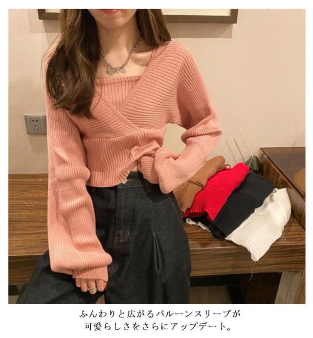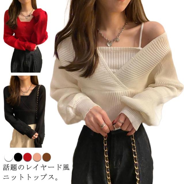 レイヤード風 ニットトップス レディース 長袖 セーター ニット プルオーバー バルーンスリーブ きれいめ トップス 重ね着風 ニットソー 伸縮性 おしゃれ 可愛い 送料無料