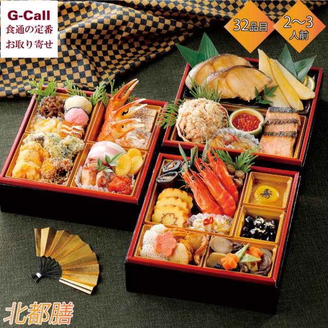 北都膳 三段重 おせち 全32品 2〜3人前 12/29お届け カネシメ高橋水産 札幌中央卸売市場 送料無料 冷凍 海鮮 おせち お節 かに 和風 年越し お正月 新年 蟹
