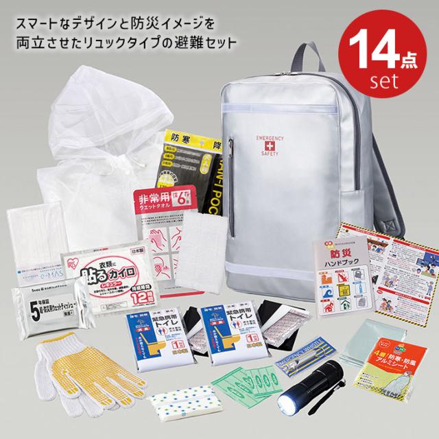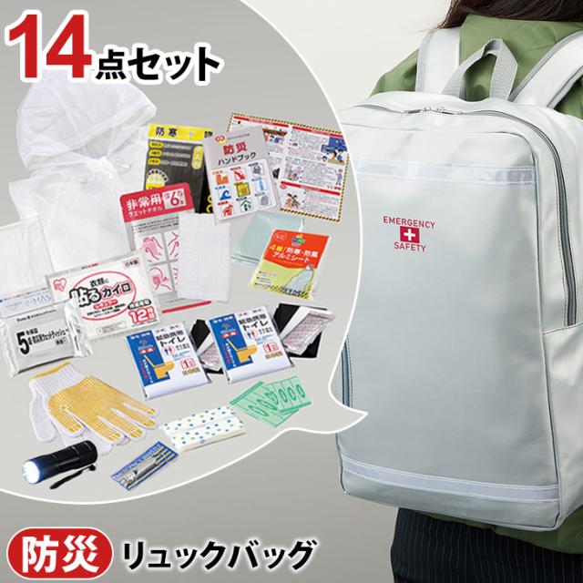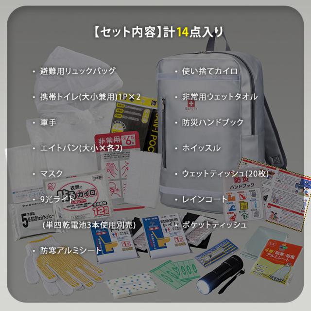 避難用リュックバッグ、携帯トイレ(大小兼用)1P×2、軍手、エイトバン(大小×各2)、マスク、9光ライト (単四乾電池3本使用別売)、防寒アルミシート、使い捨てカイロ、非常用ウェットタオル、防災ハンドブック、ホイッスル、ウェットティッシュ(20枚)、レインコート、ポケットティッシュ