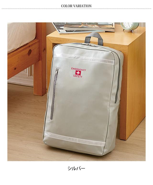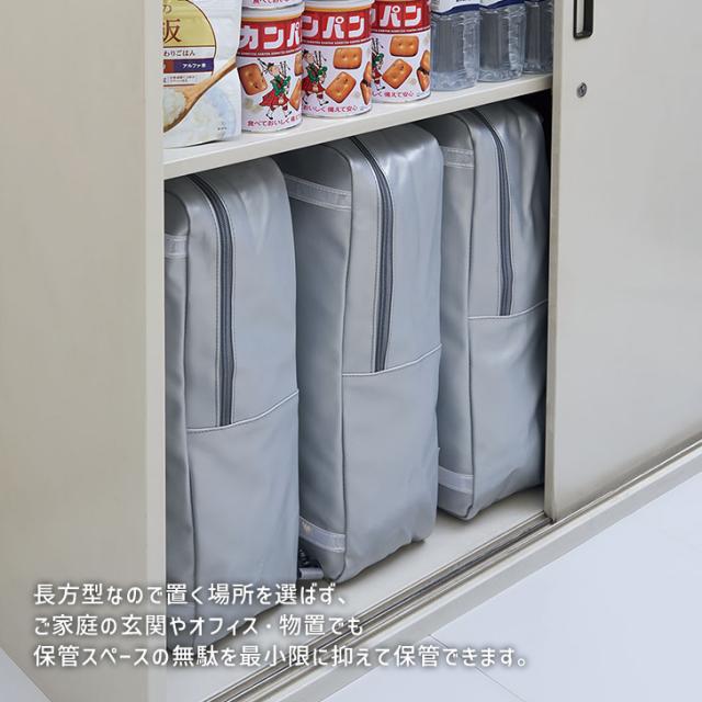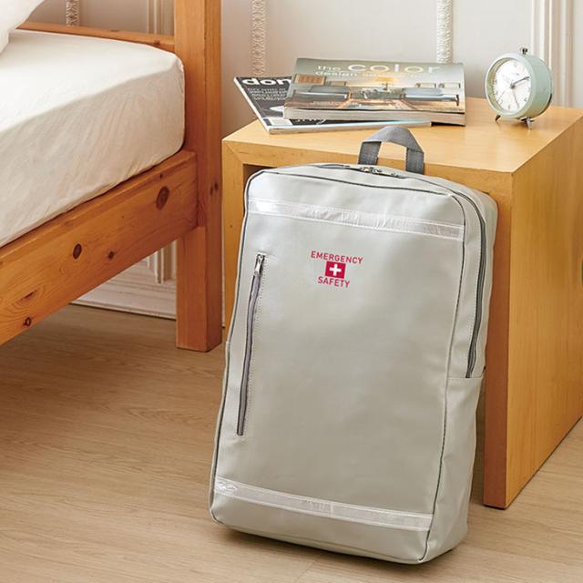 スマートなデザインと防災イメージを両立させたリュックタイプの避難セット