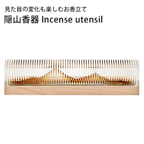 高い透明度のアクリルのカバーとメープルのウッドケースでお香を楽しむ香器、『隠山香器 Incense utensil -INZANKOKI-』。 一見するとただのアクリル板のケースに見えますが、板の隙間からお香の煙を通して燻されることでアクリルが徐々に色付き、隠れていた山の尾根が現れる素敵な仕掛けがあります。 これが「隠山(かくれやま)」と名だたる所以です。 また、このお香立てに合わせて「爽やかで甘い芳香」が特徴のサンダルウッドが付属。 サンダルウッドはリラックス効果が高く、心にゆとりを与えてくれる優しい香りです。 |