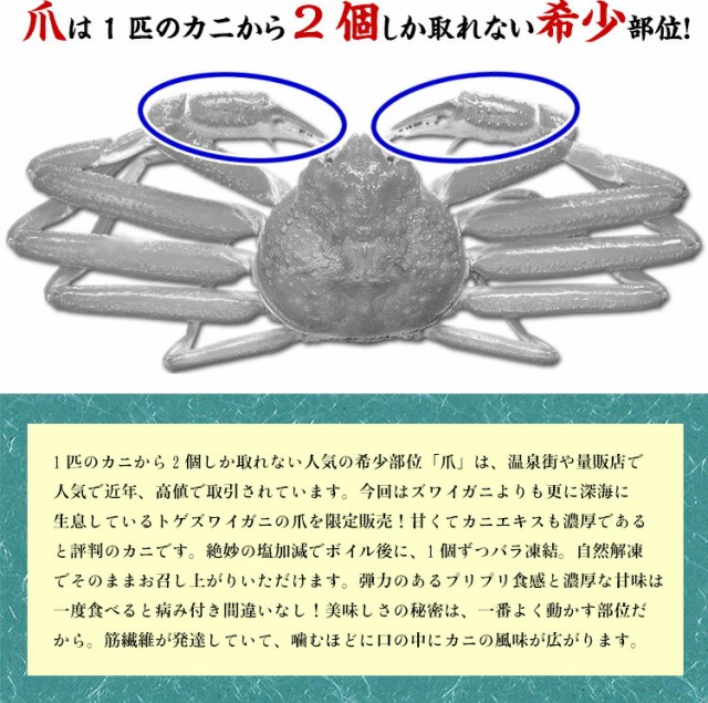1匹のカニから2個しか取れない人気の希少部位「爪」は、温泉街や量販店で 人気で近年、高値で取引されています。今回はズワイガニよりも更に深海に 生息しているトゲズワイガニの爪を限定販売!甘くてカニエキスも濃厚である と評判のカニです。絶妙の塩加減でボイル後に、1個ずつバラ凍結。自然解凍でそのままお召し上がりいただけます。弾力のあるプリプリ食感と濃厚な甘味は 一度食べると病み付き間違いなし!美味しさの秘密は、一番よく動かす部位だ から。筋繊維が発達していて、噛むほどに口の中にカニの風味が広がります。