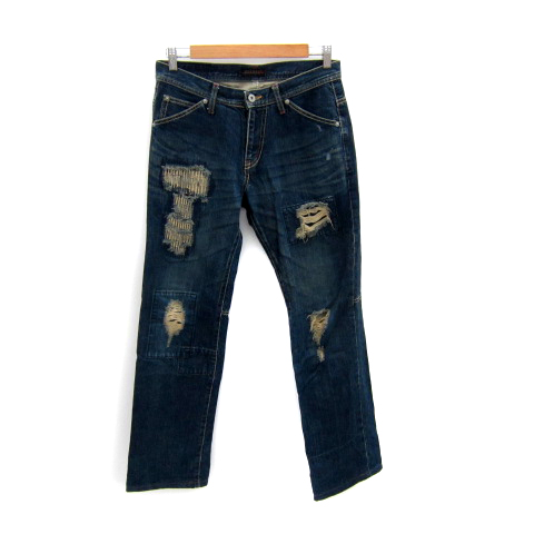【中古】MORGAN HOMME デニムパンツ ジーンズ ストレートパンツ ロング丈 ダメージ加工 L 紺 ネイビー /SY17 メンズ