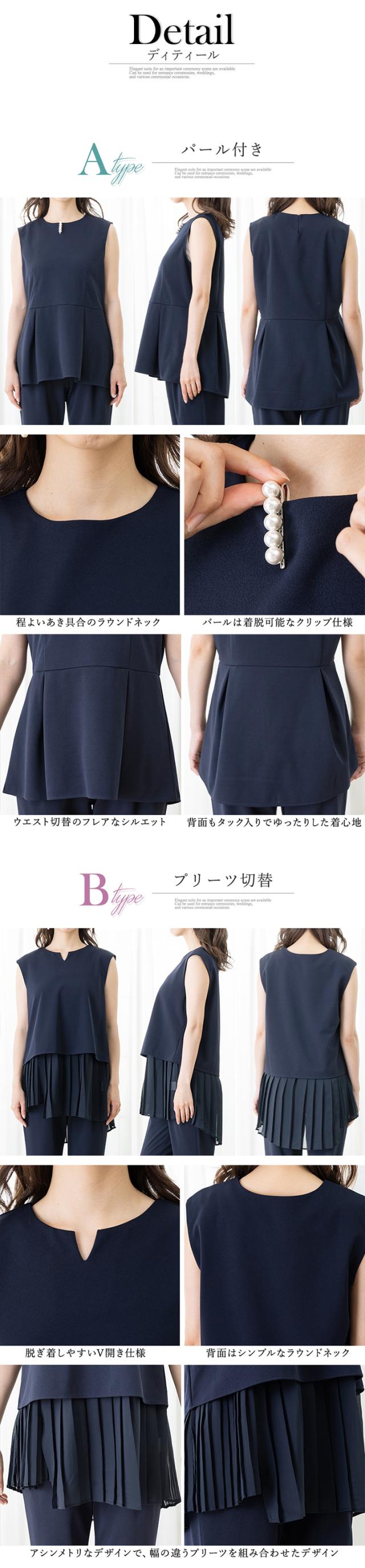 トップスは伸縮自在なストレッチ素材のカットソー。取り外しパール付き、アシンメトリな裾シフォンプリーツの2種類から選べます。