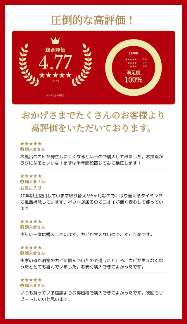 1個あたりの使用目安:浴室サイズ1坪。1坪(3.3)を大幅に上回る浴室には、効果が見えにくい場合があります。その場合は商品を2個ご使用頂くことをおすすめします。