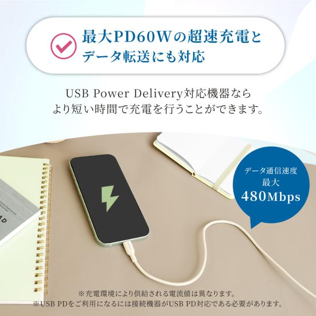 PD60W充電/データ転送 USB Type-C to USB Type-C ケーブル やわらかくて丈夫 耐屈曲1.5万回以上