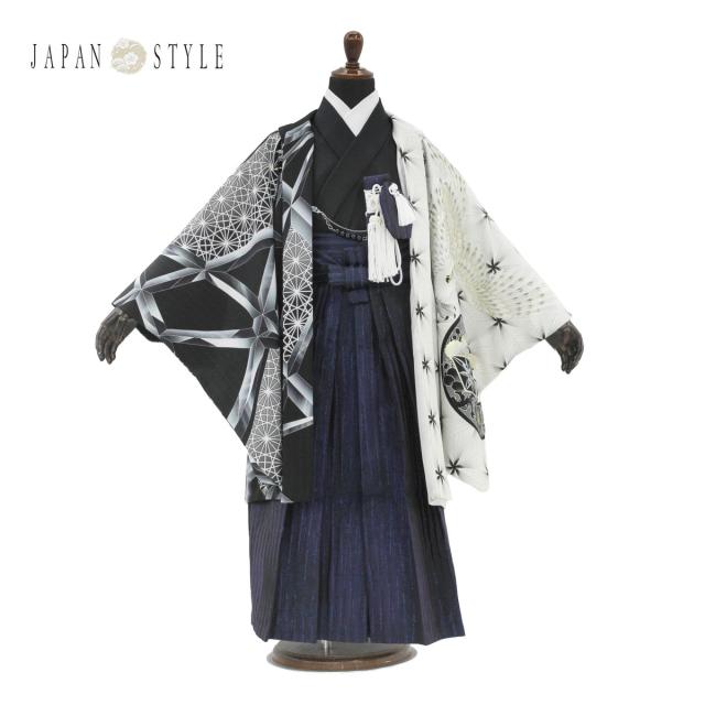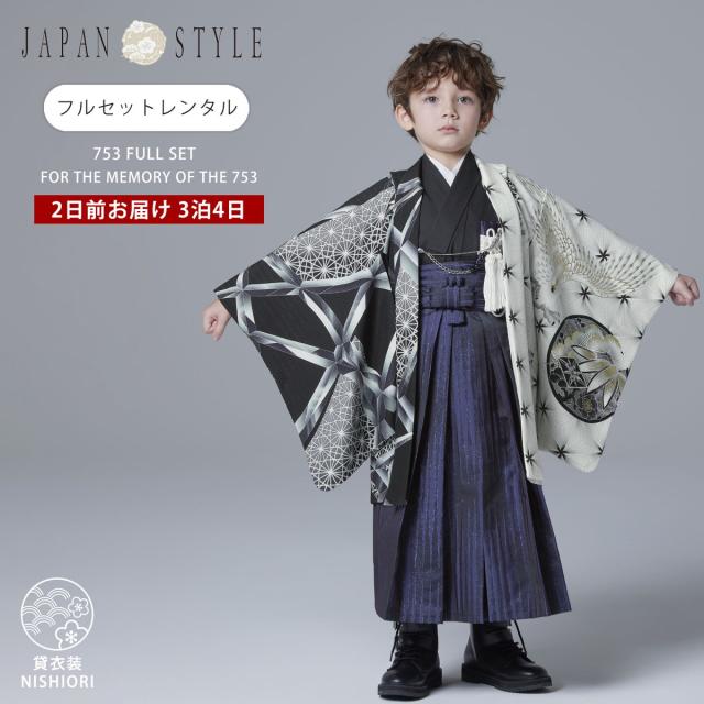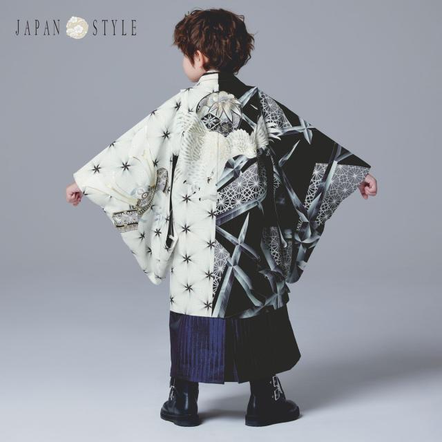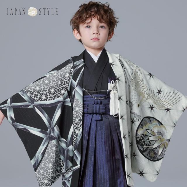JAPAN STYLE レンタル 七五三 【かんたん着付け】羽織袴 五歳 男児 着物 アンサンブル セット フルセット【5歳 貸衣装 子供 男の子 着物セット】お正月 卒業式【往復送料無料】 鷹 兜 黒 青 白 新品足袋プレゼント