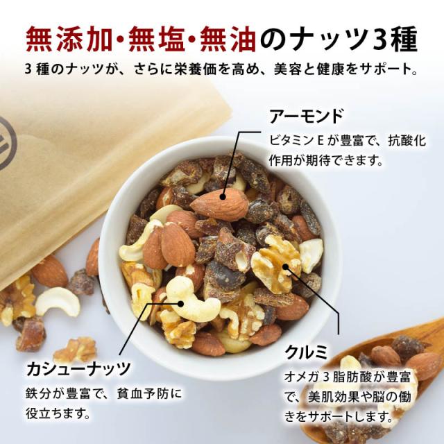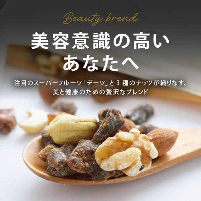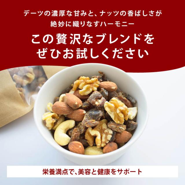 前田家でロングセラー3種類のナッツにデーツダイスをミックス!美味しさも栄養もプレミアムなミックスナッツです。無添加・無塩・無油で美容と健康をサポートします。